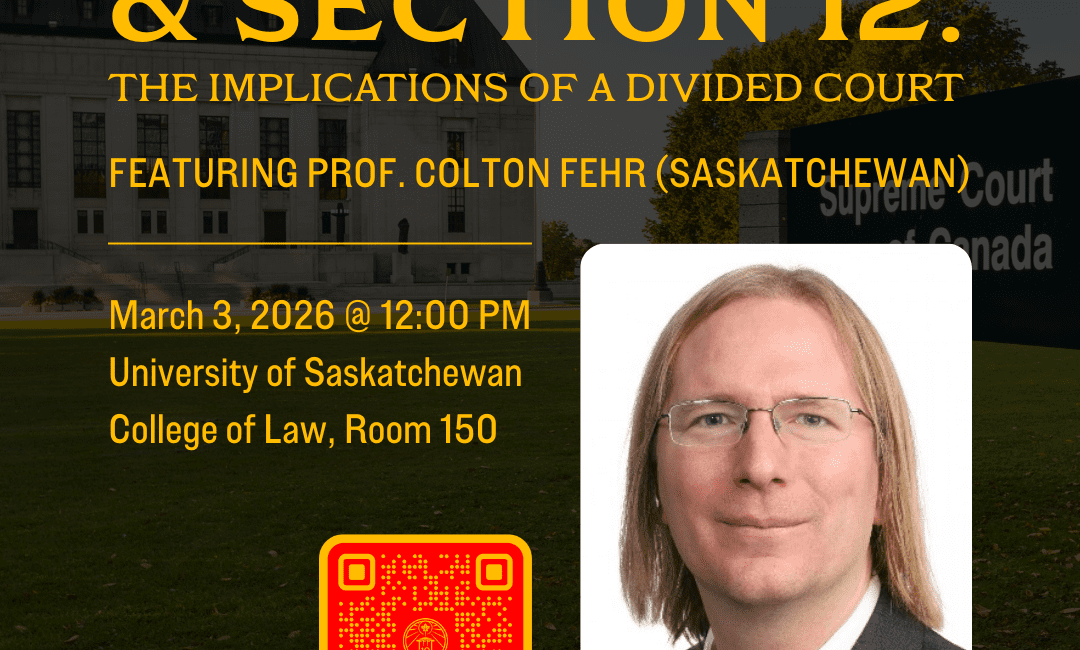 Please join the Runnymede Society’s University of Saskatchewan Chapter for a presentation on Senneville and section 12 with Professor Colton Fehr (University of Saskatchewan), on Tuesday, March 3rd. This talk will examine the Supreme Court of Canada’s divided decision in Quebec (Attorney General) v. Senneville, focusing on the meaning and...
