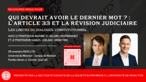 Rejoignez-vous à la section de l’Université de Moncton de la Société Runnymede pour une discussion sur l’article 33 de la Charte canadienne des droits et [...]