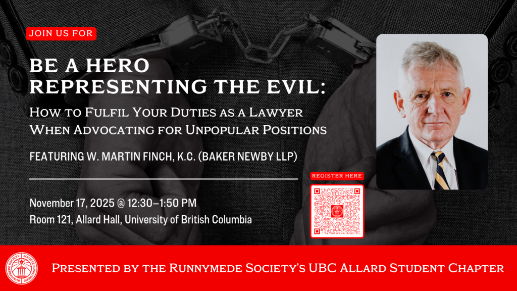 Please join the Runnymede Society’s UBC Allard Chapter for an insightful conversation about the lawyer’s professional duty to represent clients and causes that may be [...]